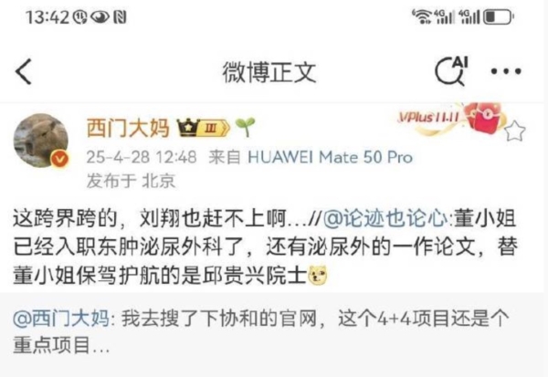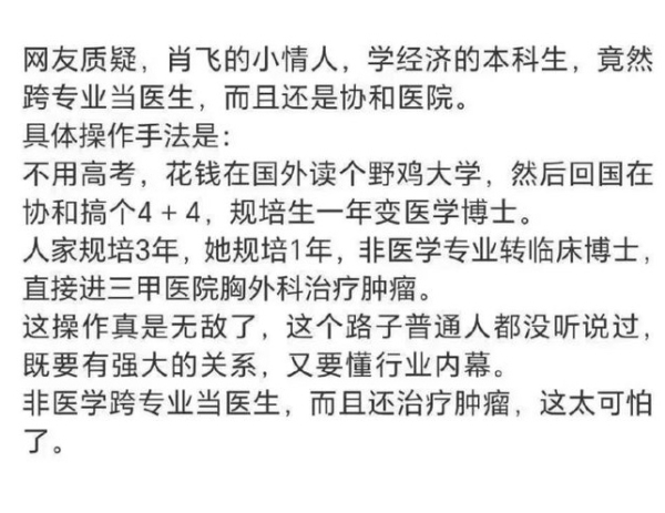 “除了狗血的出轨以外,协和的4+4确实难以理解,堪称完美后门,国内名门子弟可以不参加国内高考,只需要花钱在国外读野鸡学校学个经济学地理等专业,然后回国直接在协和医院搞个什么普通人不知道啥门道的4➕4,规培生一年就可以摇身一变成医学博士,在三甲医院直接胸外科治疗肿瘤。”