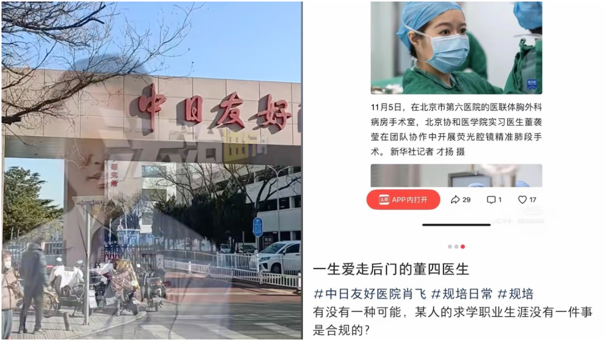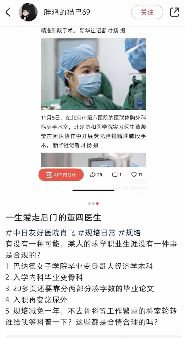 还有网友透露,董某莹规培时间从常规3年缩短至1年,并跨科室进入中日友好医院胸外科参与手术操作。