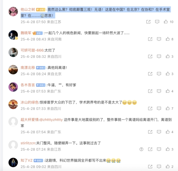 网友评论称,“这才是这个桃色事件中最可怕的,又是高校……,把不学无术的人直接送上执业医师了”“竟然这么黑?彻底颠覆三观!”“这剧情,科幻世界脑洞全开都写不出来”“这女的只读了3年医学院,还是口罩期间的网课,1年轮转找关系累的科室都不去,这样的人能上手术台能入职在最好的肿瘤医院给人看病,那些千军万马过独木桥苦读十几年的优秀人却在实验室打工患癌,世界真颠!”