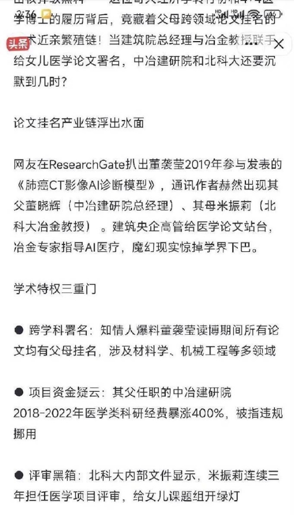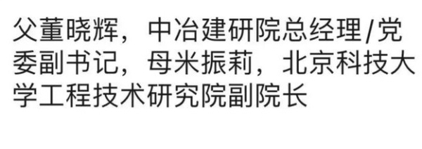 有网友扒出,董袭莹的母亲是北科大院长米某莉,父亲是中冶党委副书记董某辉。并且,其父母都利用职权为其发表医学论文署名,其母亲还疑似用职权为董某莹的课题提供便利。