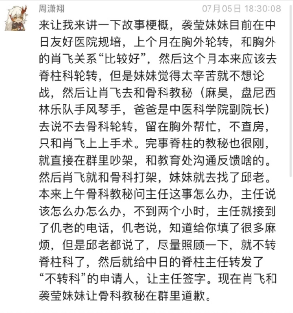 疑似协和医院内部人员去年提供爆料称,董某莹在中日医院规培期间,原本应该从胸外科轮转到脊柱科,但担心太辛苦,不听从医院安排,导致出现冲突,最后,是院士邱贵兴和该医院骨科主任仉建国出面为其讲情,董某莹得以“不转科”。