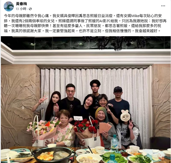 5月11日晚上,S妈在其脸书发文说,“今年的母亲节虽然令我心痛,我女婿具俊晔因为思念熙媛日益消瘦,还有女婿Mike每次贴心的安排,我还有两个孝顺的女儿。”