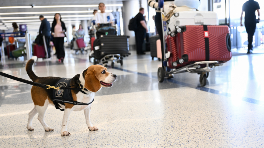 美国海关边境保护局警犬项目主管Lucy Ortiz:“我们要求人们申报他们携带的物品,这样我们才能做出监管决定,看看物品能否入境。我们还有比格犬大军,它们接受过训练,可以检测出各类农产品。”