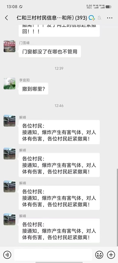 据高密市仁和三村村民聊天群发出信息显示:“各位村民:接通知,爆炸产生有害气体,对人体有伤害,各位村民赶紧撤离!”