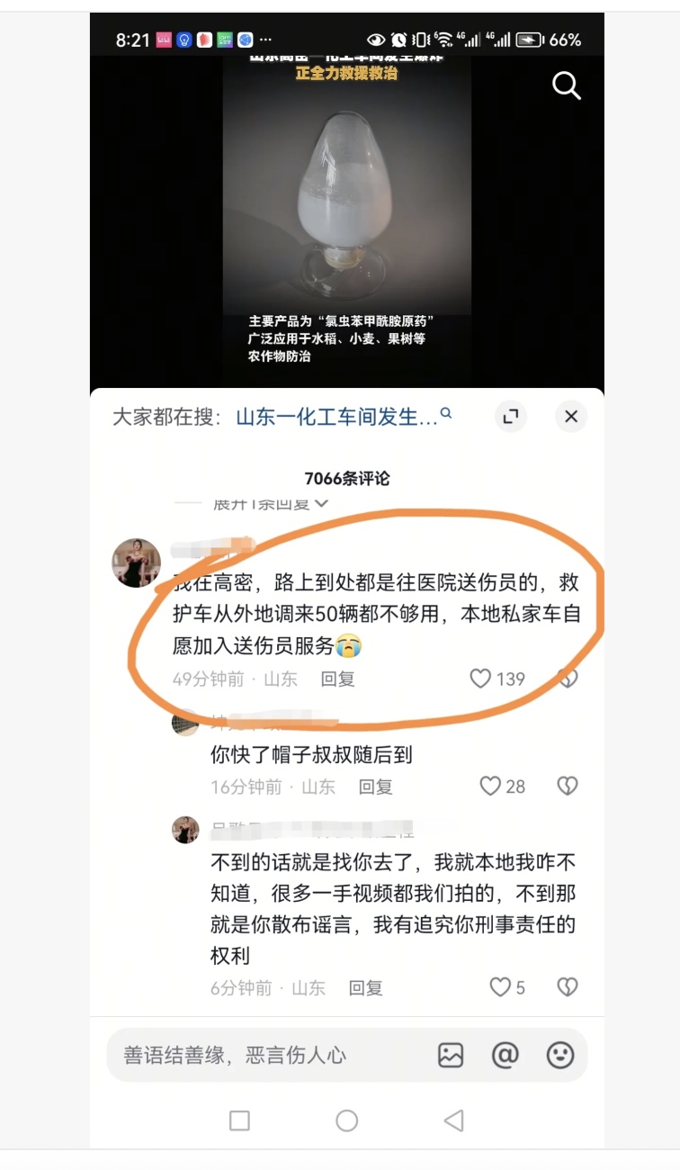 有当地网友说,“救护车都拉不过来了,好几辆好几辆的拉”“已经没了好几个了”“视频里面罐上的工人都飞了两个”“我在高密,路上到处都是医院送伤员的,救护车从外地调来50辆都不够用,本地私家车自愿加入送伤员服务”“还几十公里外都能有震感,破坏力有多大”“5人是个线,只能报5人”。
