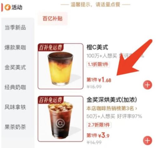 在京东App上,库迪咖啡的橙C美式、柠萃美式等多款单品,现在最低仅需1.68元(人民币,下同),商品图片左上角清晰标注着“百亿补贴免运费”字样,加上打包费,最后结算一单也仅需2.68元。