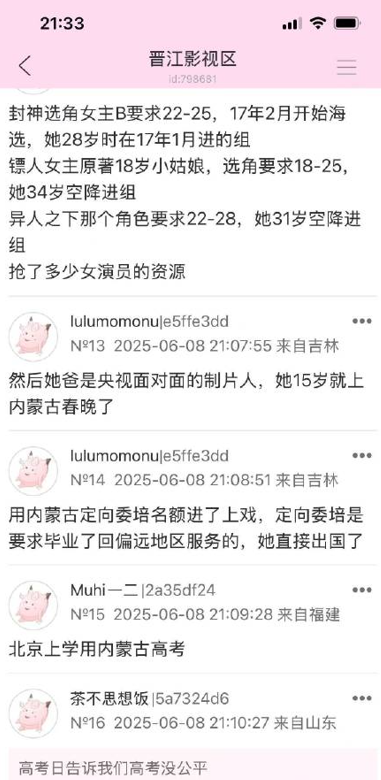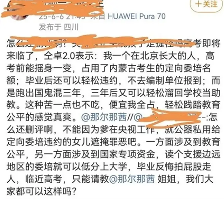 【新!唐!人:北京时间2025年06月09日讯】6月9日,中国大陆女演员那尔那茜被曝“高考移民”、占用定向委培名额等问题,其父亲被指在中共央视工作。事件很快发酵,中共官媒立即删除其高考祝福的视频。