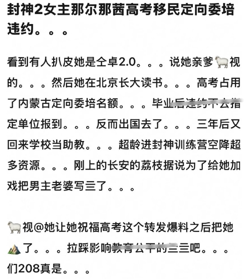 该网友爆料说,那尔那茜的父亲在央视工作,家里条件非常好,她从小就学习马术、格斗和中国鼓等。高考前,在家里的操作下,她回到内蒙古高考,占用了定向委培名额,轻松考入了上海戏剧学院。