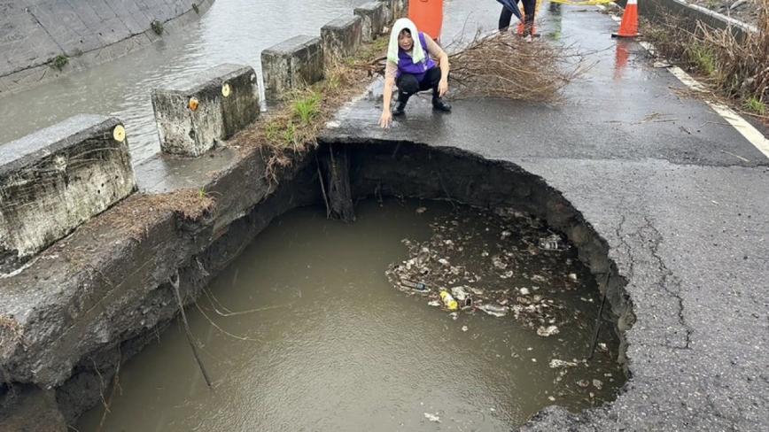 【新!唐!人:北京时间2025年07月10日讯】近日豪大雨接连轰炸台湾中南部,许多地区纷纷传出灾情,在彰化埔心乡今天(10日)清晨6点左右出现一个巨大天坑,几乎占据半个路面,有辆小货车行经时闪避不及车头栽进天坑内,所幸并未造成人员伤亡。另外,目前在嘉义、台南及高雄地区还有6万8千户停电,台电正在积极抢修中。