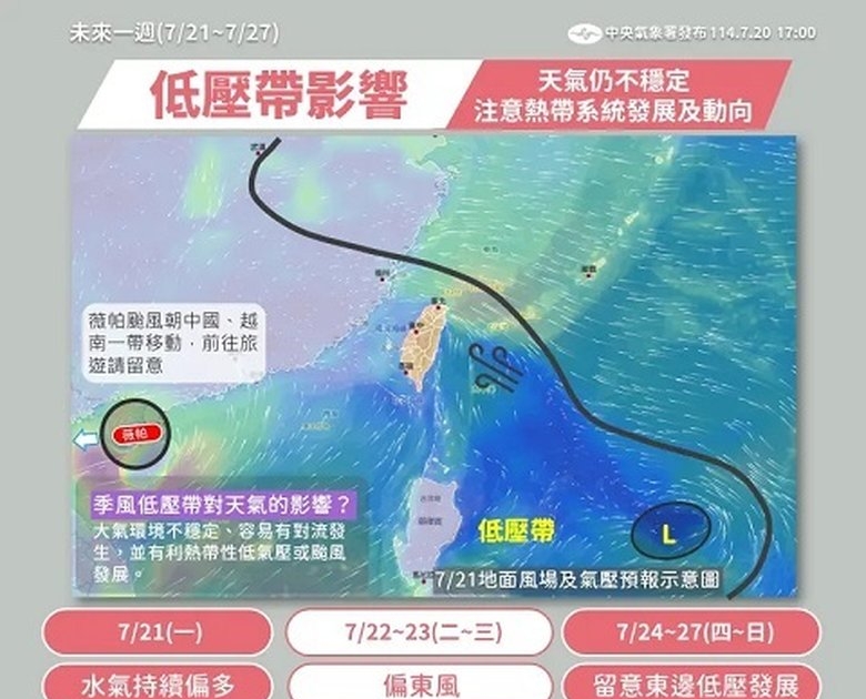 气象署表示,目前低压带中有机会生成台风,但由于发展不是非常好,预估发展速度不会那么快,未来路径还要再观察。