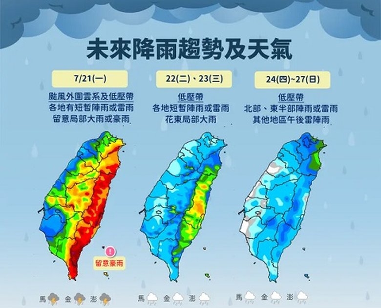 气象署今天(21日)清晨针对东半部地区发布豪大雨特报,其中大豪雨地区为台东县,豪雨地区为花莲县,大雨地区包括屏东县、宜兰县以及连江县,这些地方今天降雨时间都较长,有雷雨或阵雨,花东则有大雨或豪雨发生概率;南部、东北部、大台北则有阵雨或雷雨,山区则有大雨概率。各地气温为北部24至30度、中部24至34度、南部24至33度、东部24至30度。