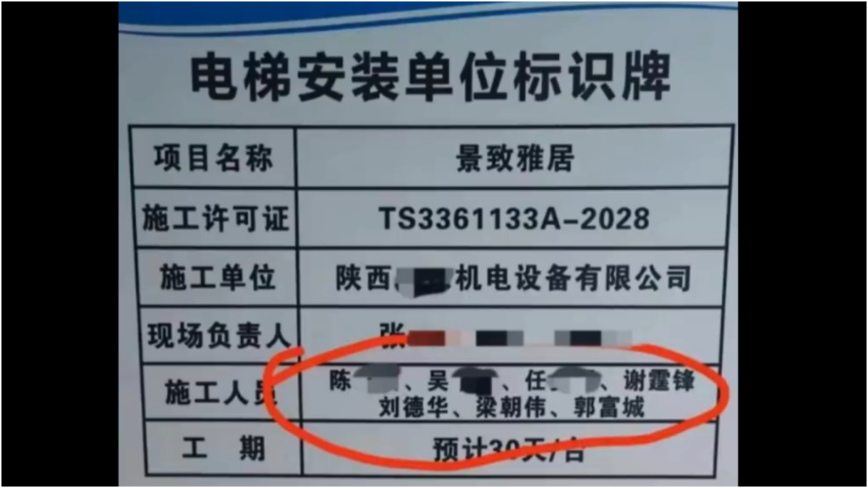 【新!唐!人:北京时间2025年08月16日讯】8月16日,陕西西安一小区的“电梯安装单位标识牌”上,施工人员名单竟出现了“谢霆锋、刘德华、梁朝伟、郭富城”香港大牌艺人的名字,引发热议。