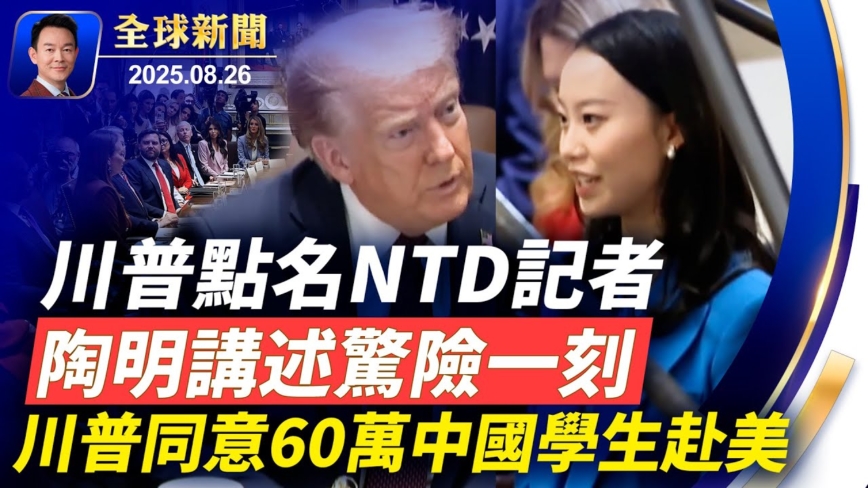 【新!唐!人:北京时间2025年08月27日讯】川普内阁会议点名陶明 新!唐!人:记者分享经历获赞;前线告急?乌克兰首度承认 俄军攻入中部行政区;60万中国学生获允赴美 舆论忧中共间谍风险;卡车司机须会英语 美交通部向三州发最后通牒;喧嚣中的善良力量 法轮功学员洛市揭中共跨国镇压;斯威夫特与凯尔西订婚 川普祝贺。