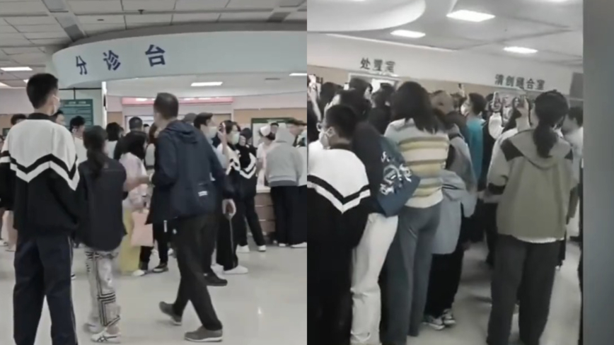 视频:“妈呀,现在的医院,今天山西所有的医院爆满,是所有的医院。全是孩子们,整个学校住宿的,整个班都来了。”