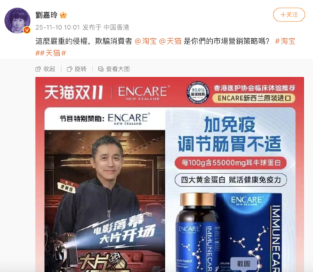 “刘嘉玲喊话淘宝天猫欺诈消费者”的词条,登上微博热搜榜首,引发热议。