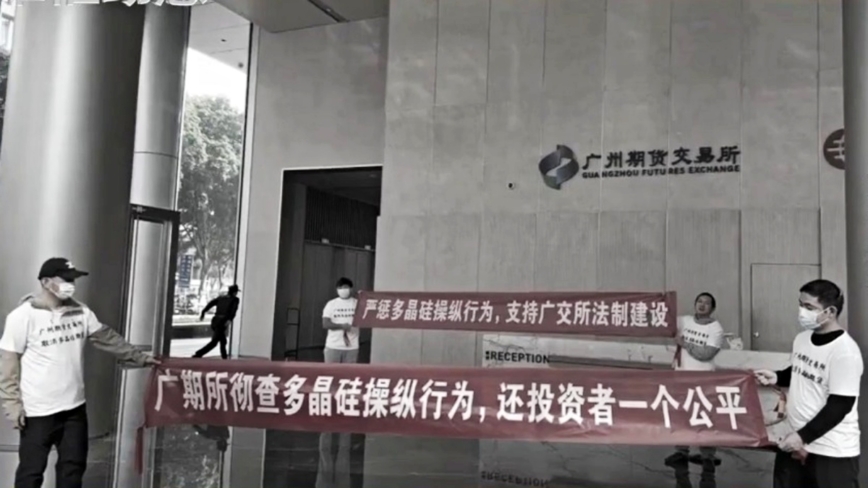 广州期货交易所的多晶硅期货交易,近期出现短时间内暴涨暴跌现象,投资者认为存在欺诈性炒作的市场操纵行为。日前到交易所大厅内拉横幅抗议,要求当局彻查。