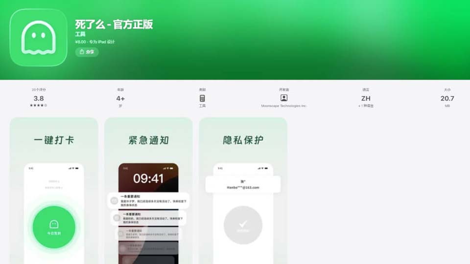 据陆媒报导,“死了么”由月境(郑州)技术服务有限公司开发,是为独居人群打造的轻量化安全工具,目前仅在中国的苹果App Store上架,安卓系统暂未推出,定价已从最初的免费改成人民币8元。