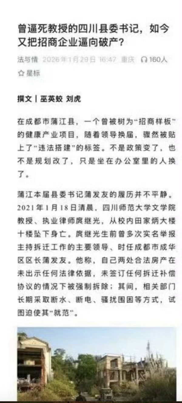 2026年1月29日,刘虎与巫英蛟在自媒体平台发布署名文章《曾逼死教授的四川县委书记,如今又把招商企业逼向破产》,指控蒲江县委书记蒲发友存在三项问题:第一,强拆致死:蒲发友任成华区区长期间,暴力强拆导致四川师范大学教授庹继光于2021年跳楼自杀;第二,毁约逼停招商项目:山西商人王先生2020年投资的月子中心项目,因蒲江县单方面毁约被扣“违法搭建”罪名停工,损失超1200万元,并称蒲发友意图强占房产建幼儿园套取资金;第三,公职人员索贿:提供聊天记录指原蒲江县公安局政委彭兴莉索股索贿。