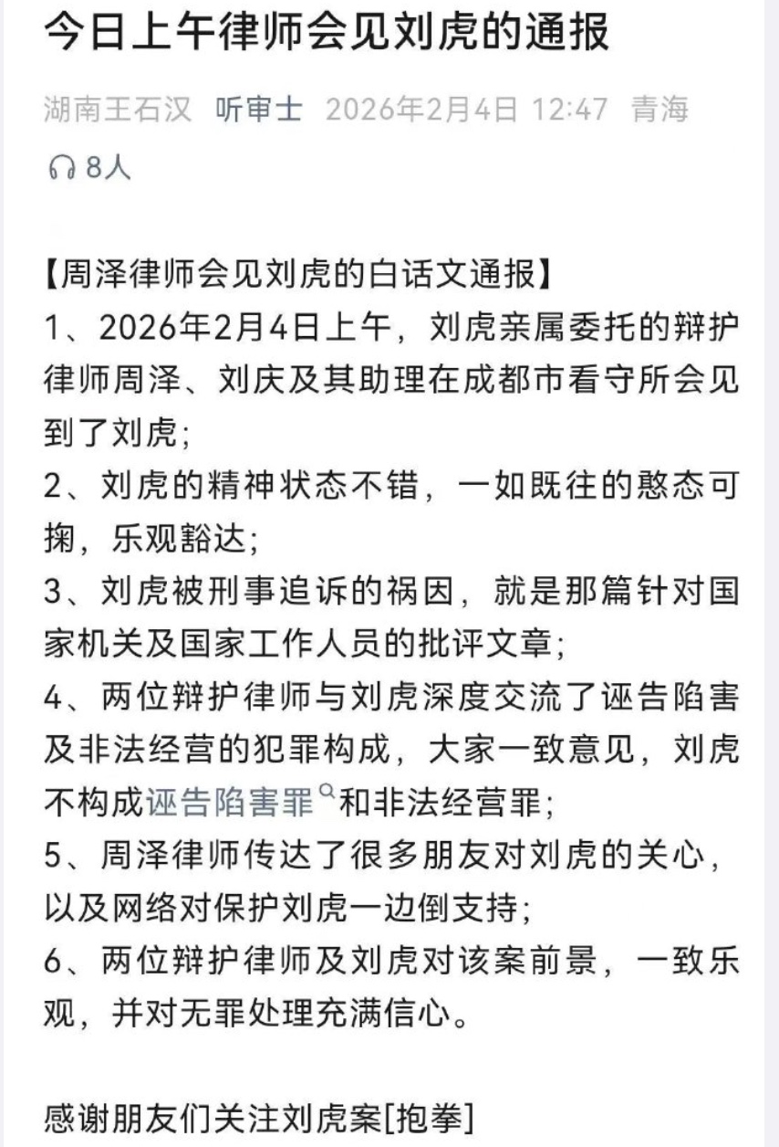 2月4日上午,刘虎的辩护律师周泽发出消息说,已经会见了刘虎,“这只以前见过多次的‘老虎’,还是那副憨态可掬的样子。我们交流了诬告陷害及非法经营的犯罪构成,以及一篇针对国家机关及国家工作人员的批评文章构成诬告陷害罪和非法经营罪的不可能性。我传达了很多朋友对老虎的关心,及网络对保护‘老虎’这类珍稀动物的一边倒支持。对珍稀动物保护的前景,我们一致感到乐观”。