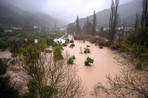 2026年2月4日,西班牙南部城市龙达的一张照片显示,房屋周围的田地已被洪水淹没。(JORGE GUERRERO / AFP via Getty Images)