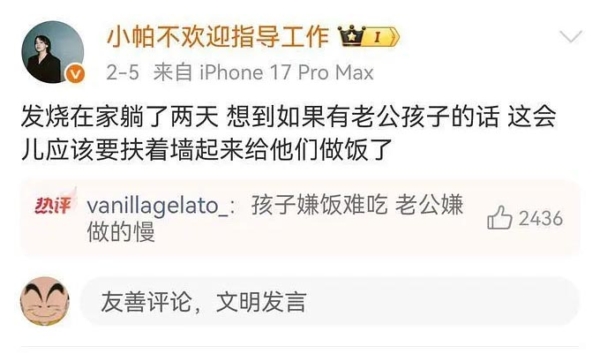 新疆脱口秀女演员“@小帕不欢迎指导工作”2月5日在微博说了一句话:“发烧在家躺了两天,想到如果有老公孩子的话,这会儿应该要扶着墙起来给他们做饭了。”