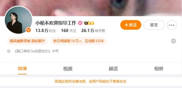 微博社区观察员官方账号“@围脖侠”于27日发文,指责“@小帕不欢迎指导工作”发布“挑动性别对立、制造婚育焦虑”的信息,因所谓“违反相关法律法规和专项行动要求”,被责令予以禁言处置,平台“作为执行方执行禁言要求”。