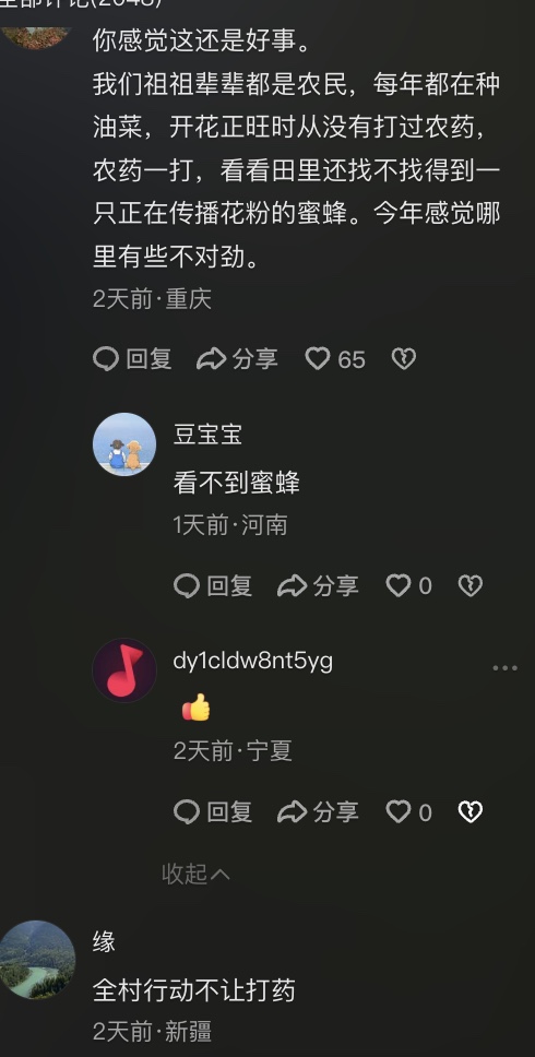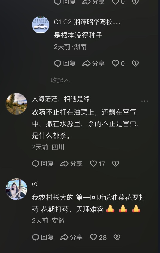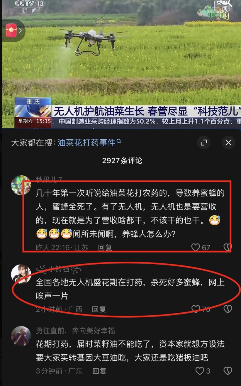 网友批评:“几十年第一次听说给油菜花打农药的,导致养蜜蜂的人,蜜蜂全死了。有了无人机,无人机也要营收的,为了营收,啥都干,不该干的也干”“我们祖祖辈辈都是农民,每年都在种油菜,开花正旺时从没有打过农药,农药一打,看看田里还找不找得到一只正在传播花粉的蜜蜂。今年感觉哪里有些不对劲”“种了几十年的油菜,从来没有给油菜花打药过”“这还让他打农药 颗粒无收”“农药不止打在油菜上,还飘在空气中,撒在水源里,杀的不止是害虫,是什么都杀”“我农村长大的,第一回听说油菜花要打药”“花期打药,天理难容”。