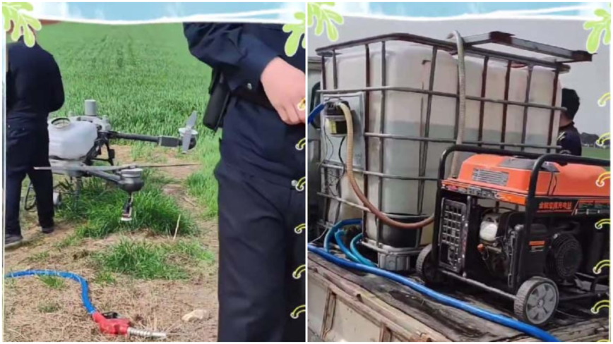 3月20日,大陆社交媒体传出一段视频显示,某地农民发现有多名不明人员操控无人机给麦田打药,装载药物的车就停在路边,于是报警叫来公安。