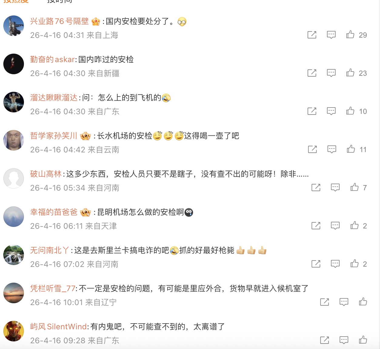 此消息引发了中国网友的关注。很多网友呼吁严惩,也有一些网友纷纷质疑昆明机场的安检有问题:“国内咋过的安检?”“问:怎么上得到飞机的”“这多少东西,安检人员只要不是瞎子,没有查不出的可能呀!除非……”“不一定是安检的问题,有可能是里应外合,货物早就进入候机室了”“有内鬼吧,不可能查不到的,太离谱了”。
