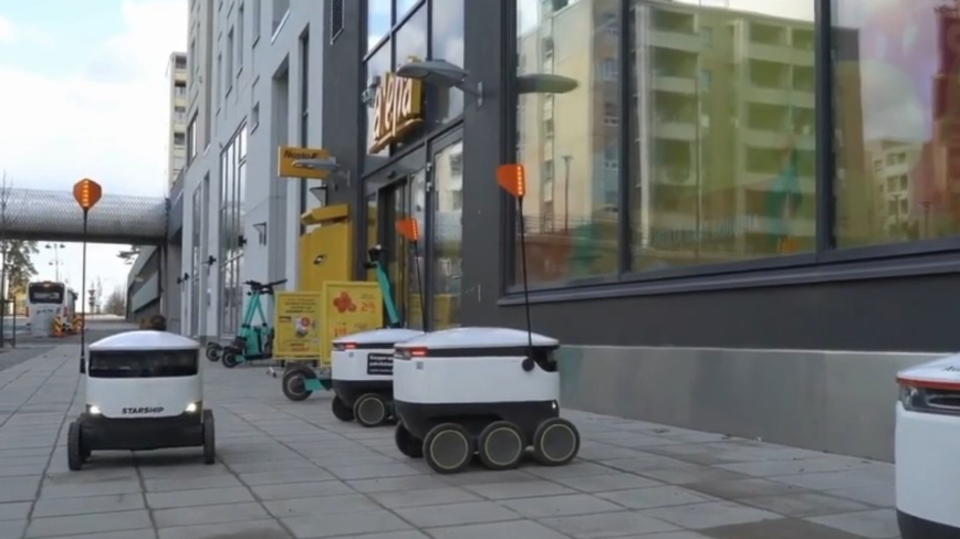 一群游客在图尔库市路边喝咖啡、吃午餐。突然,两个送餐机器人,正努力试图跨越马路牙子。