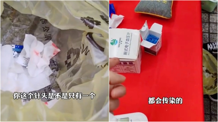 视频显示,在诊断台处,有女士询问采血人员,针头有没有换,采血称“换了”。居民检查现场的垃圾袋,发现里面没有废弃的针头,于是质问:“你这个针头是不是只有一个?你们换下的针头在哪里?这么多人采血,就一个针头?针头重复使用,乙肝、丙肝、艾滋(病)都容易传染的,你说怎么办,这是严重违规的呀。”