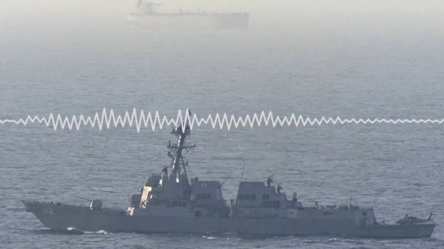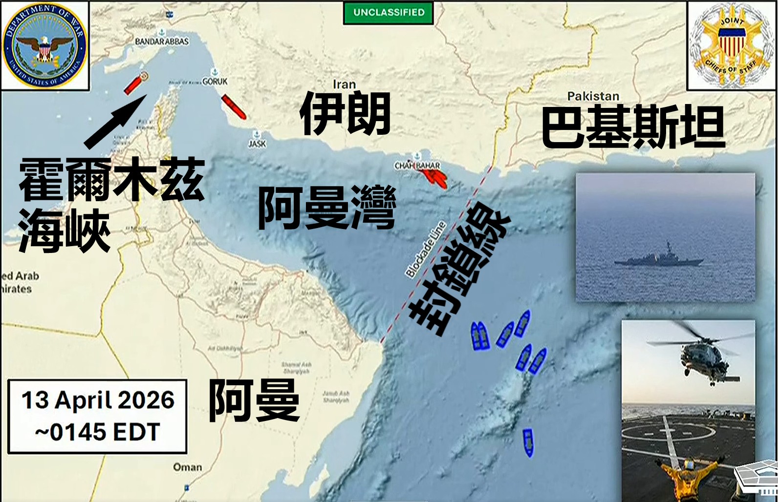 2026年4月13日,美军在阿曼湾出口划定封锁线,开始对进出伊朗船只实施海上封锁。(美国战争部视频截图/大.纪.元;制图)