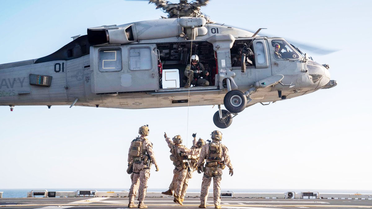 2026年4月16日,美国海军陆战队员在两栖攻击舰“的黎波里号”(USS Tripoli,LHA-7)的甲板上进行直升机吊挂训练。(美国中央司令部)