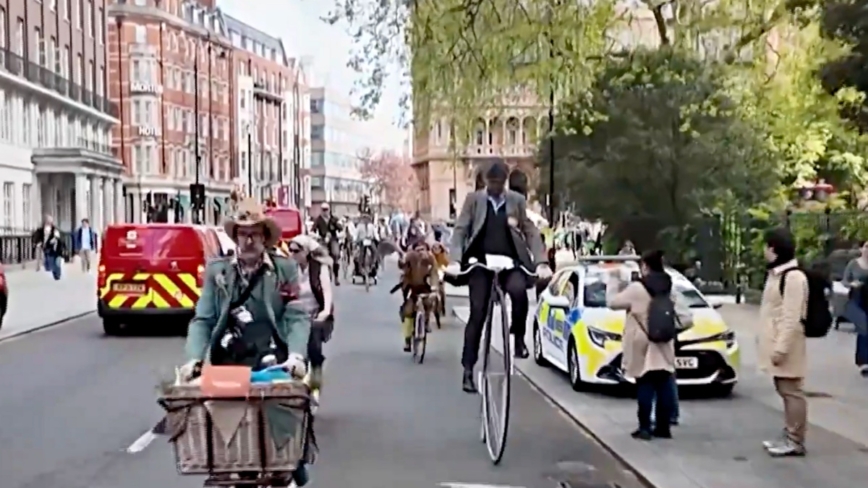 【新!唐!人:北京时间2026年04月19日讯】周六(4月18日),伦敦街头化身为复古伸展台——近千名骑士身穿英式花呢、骑着古董高轮自行车,沿着市中心一路巡游,展现最具代表性的英式风情。