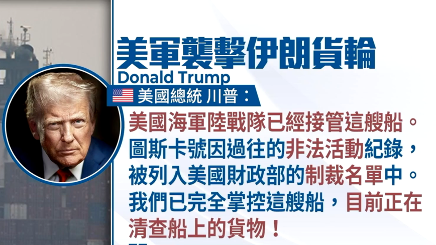 【新!唐!人:北京时间2026年04月20日讯】美伊紧张局势再度升高。美国总统川普,周日表示,一艘伊朗货船不听从警告,美军因此对其引擎舱发动攻击,炸出破洞,迫使船只停止航行。