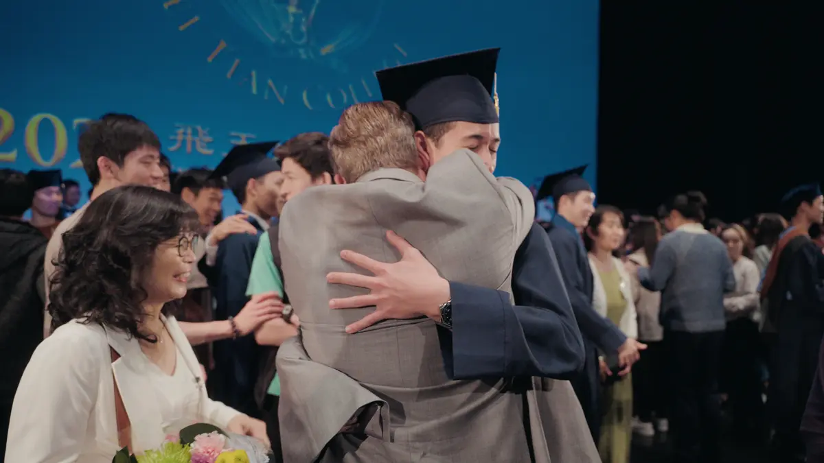 布劳德(Levi Browde)在飞天校园的毕业典礼上拥抱儿子包明宇(Lucas Browde)。(Paulio Shakespeare/NTD)