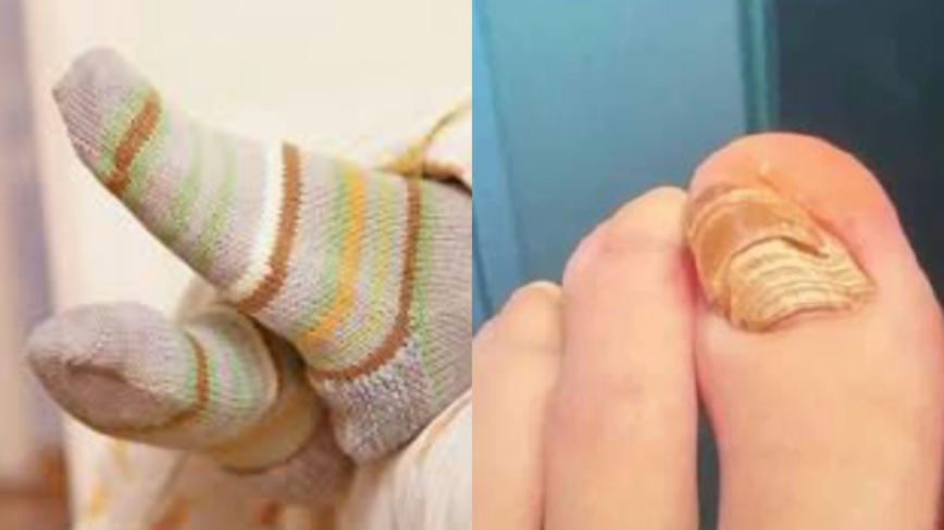 医生强烈建议不要穿袜子睡觉,因为夜间是指甲自然生长、向前舒展的关键时期,如果穿袜子睡觉,脚趾长期被袜子紧紧包裹,新生指甲易受挤压向下生长,导致层层叠加变形。