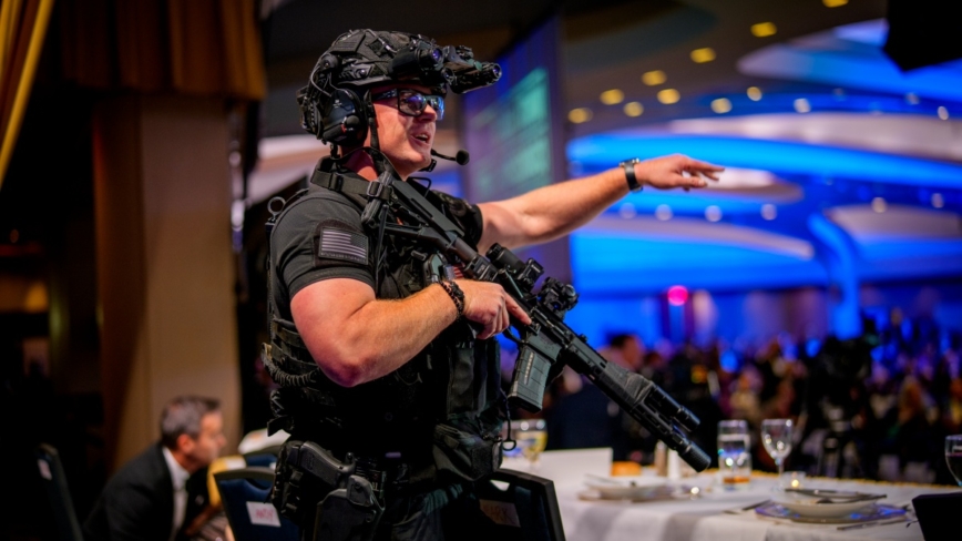 白宫记者晚宴,川普总统和第一夫人梅拉妮娅首次以在任总统身份出席。晚宴刚上第一道菜,就听到外面枪声大作,特勤局人员高喊“趴下”,所有人迅速躲藏。