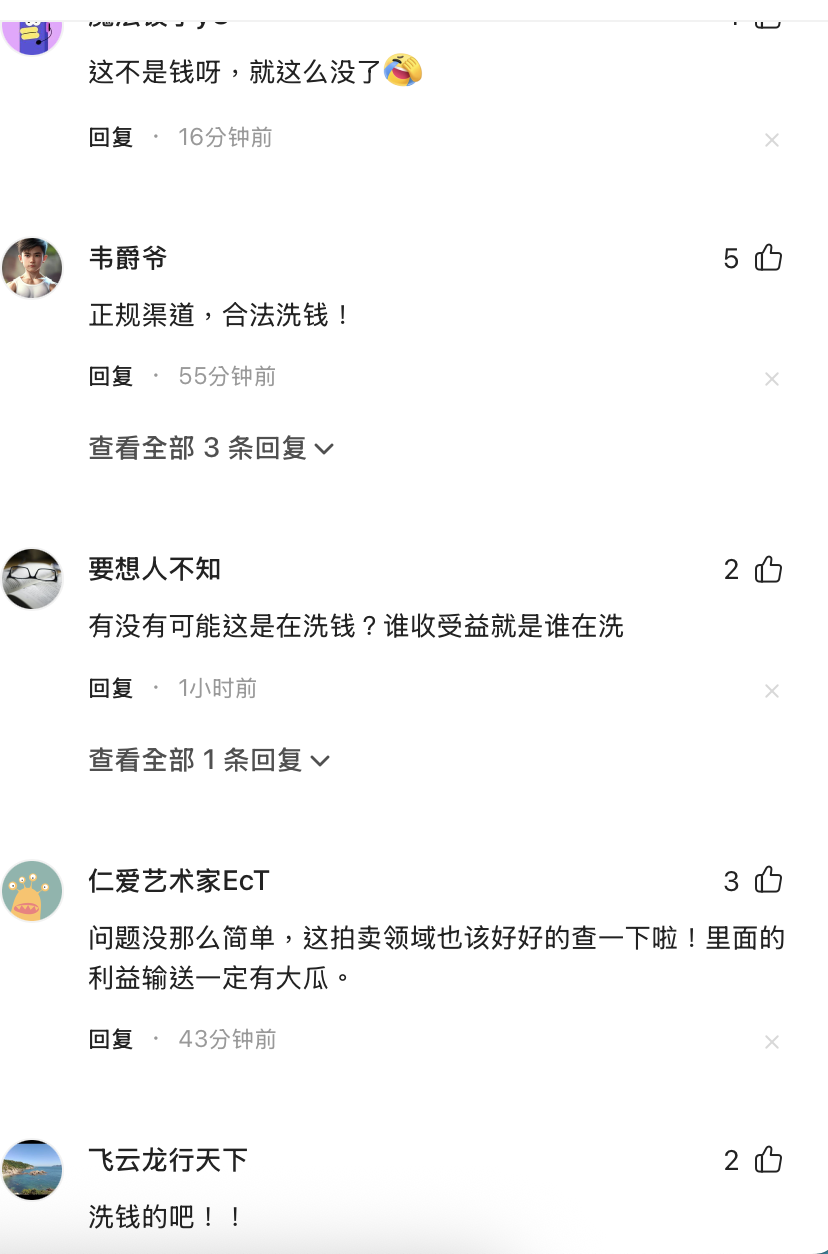 不少网友质疑这起法拍涉及洗钱:“这不叫亏752万,这叫过帐752万,不然钱以什么名义转出去。”“保证金最后进了谁的口袋?业主还是拍卖公司?”