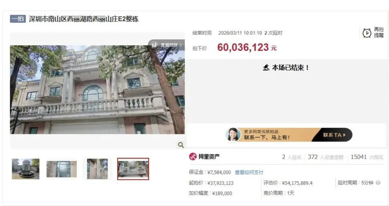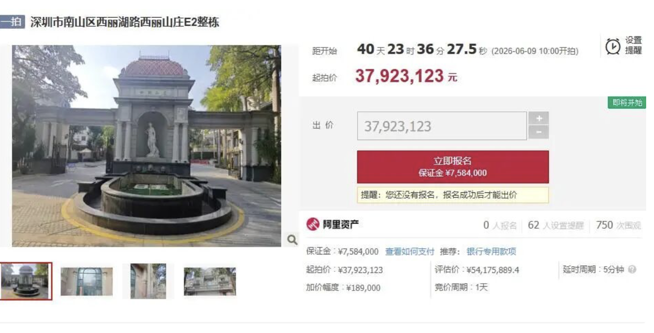 综合陆媒4月29日报导,近日,在阿里法拍平台上,深圳南山区西丽山庄一栋别墅,以3792万余元价格起拍。